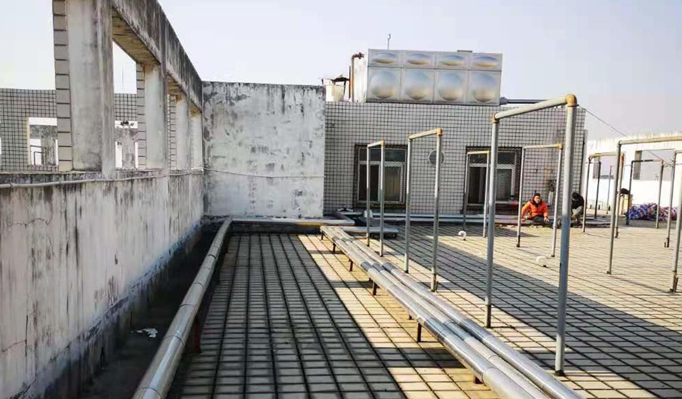 卓益冷凝熱水模塊爐,配置20噸方形水箱,供2棟宿舍樓里的近800員工洗浴使用。